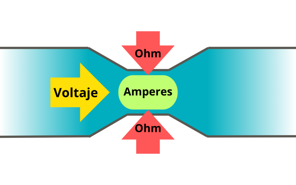 En la representación que se muestra se puede observar como el voltaje empuja la corriente y los Ohm que representan la resistencia impiden el flujo excesivo de la corriente para evitar daños en los circuitos.